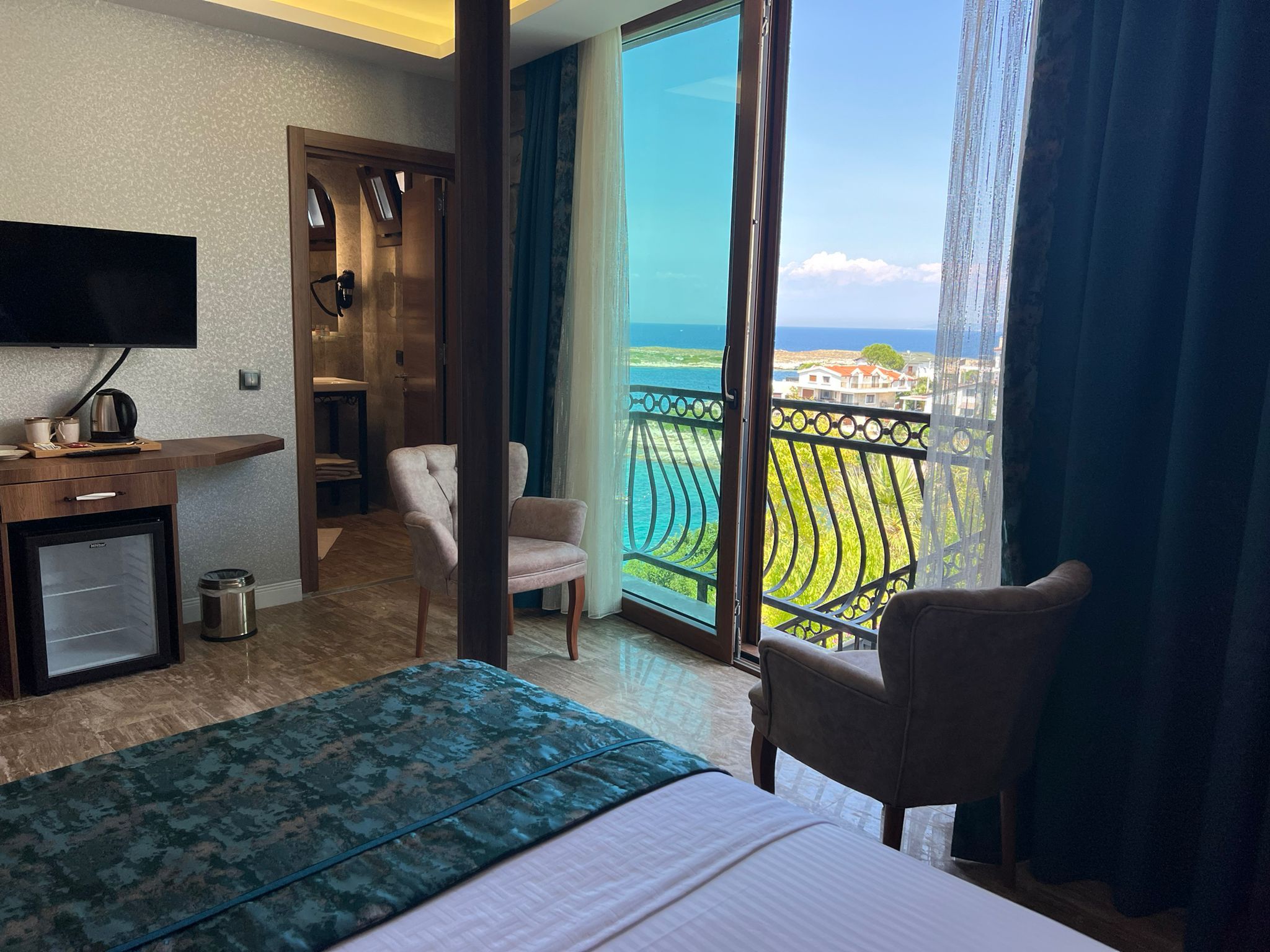 Full deniz manzaralı ve bol aydınlık özel dizayn edilmiş odamız, 2 kişi konaklamaya uygundur.